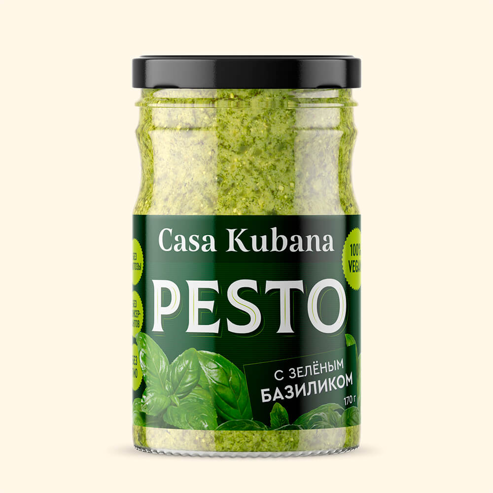 Масло подсолнечное рафинированное дезодорированное, базилик свежий, вода питьевая, ядра орехов кешью, пюре картофельное сухое, дрожжевой экстракт, соль морская пищевая, натуральное пищевое волокно, масло оливковое нерафинированное высшего качества (Extra virgin olive oil), чеснок сушёный, ядра кедрового ореха, регуляторы кислотности (лимонная кислота, молочная кислота).
