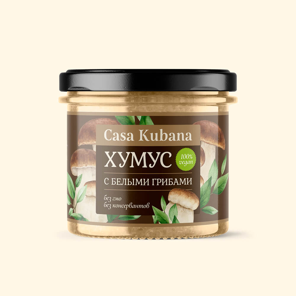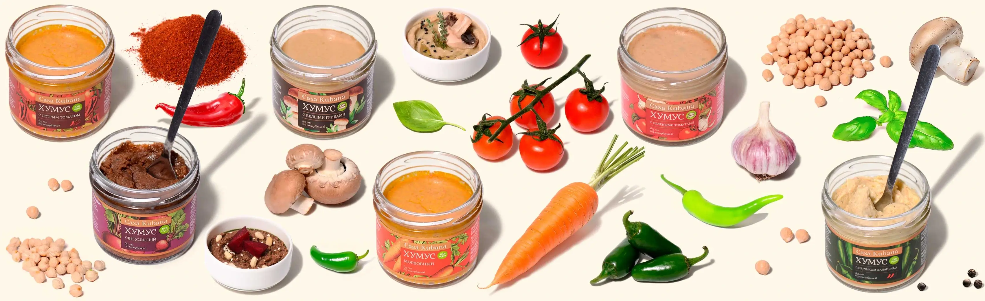Нут, вода питьевая, масло подсолнечное рафинированное дезодорированное, тахини (кунжутная паста), экстракт дрожжевой, соль морская пищевая, чеснок сушёный, загуститель (камедь гуаровая), кумин, перец красный острый сушёный, куркума.